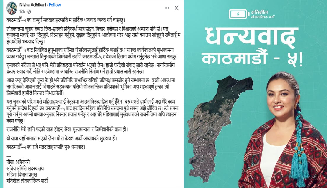 काठमाडौं – गतिशील लोकतान्त्रिक पार्टीकी महिला विभाग प्रमुख एवं अभिनेत्री निशा अधिकारीले काठमाडौं–५ का मतदाताहरुलाई धन्यवाद दिएकी छिन् ।