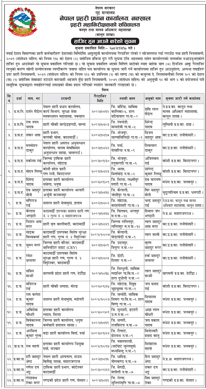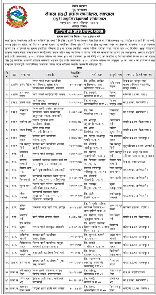 २ असईसहित २ दर्जन प्रहरीलाई ७ दिनभित्र सम्पर्कमा आउन हेडक्वार्टरको निर्देशन