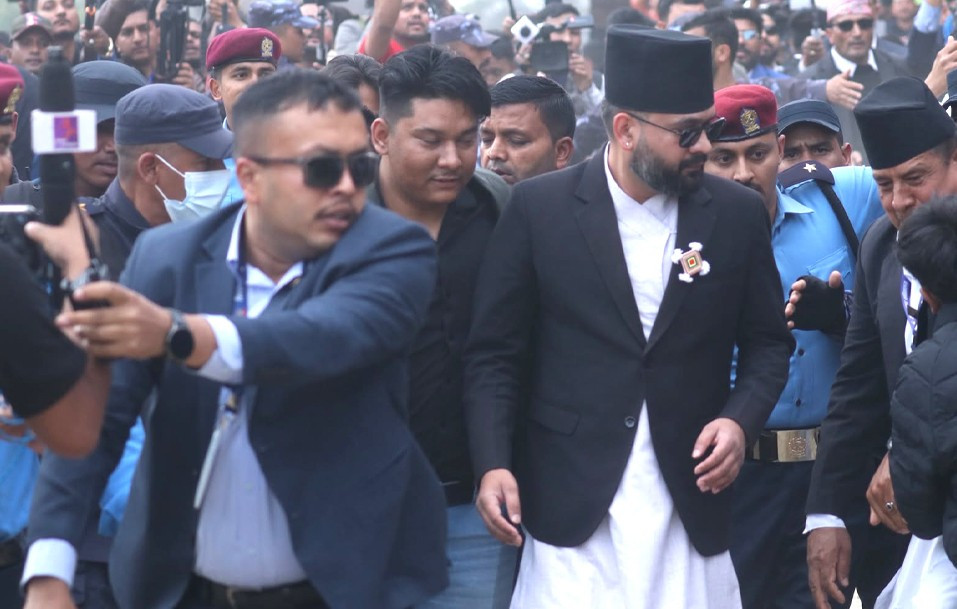 सञ्चारकर्मीको घेरामुक्त गरेर नेता शाहलाई भवनको बहुउद्देश्यीय हलमा जाने ढोकातर्फ ल्याउन सुरक्षाकर्मीलाई हम्मेहम्मे परेको थियो । सुरक्षाकर्मीको सहयोगमा शपथ हलतर्फ जाने क्रममा उपस्थित महानुभावले ‘बालेन सरकार’ भन्दै अभिवादन टक्र्याउँदा नेता शाह मुस्काउँदै भित्र प्रवेश गरे ।