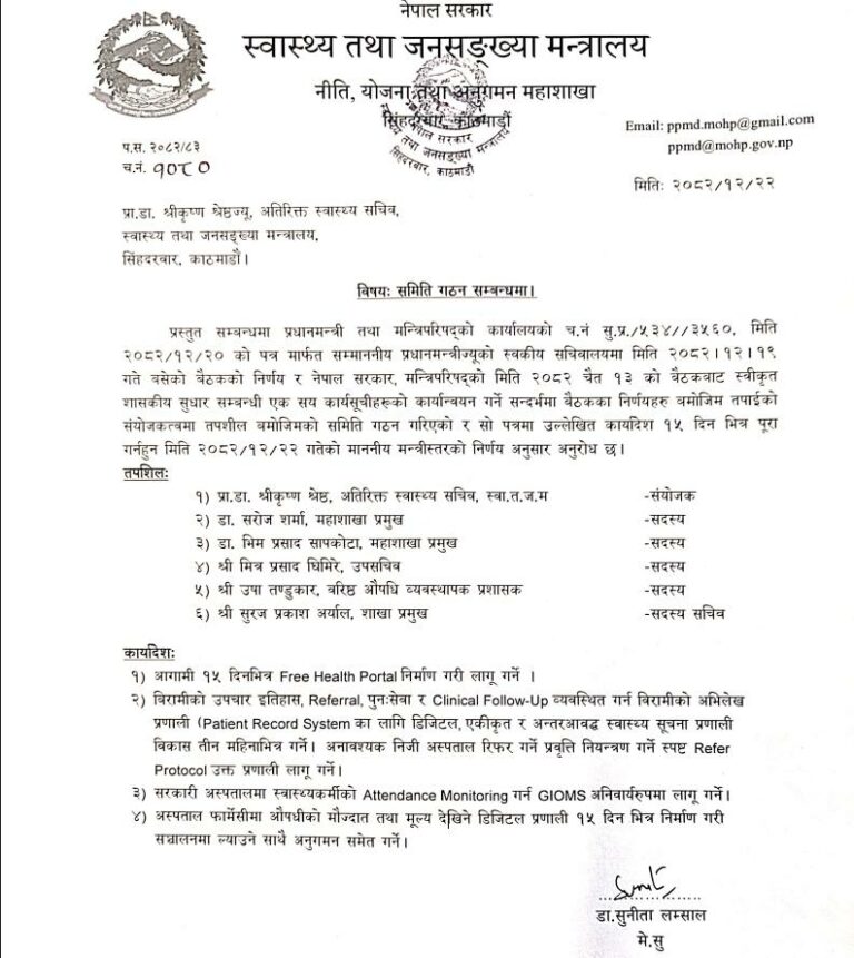 आइतबार मन्त्रीस्तरीय निर्णय गर्दै स्वास्थ्य तथा जनसंख्यामन्त्री निशा मेहताले मन्त्रालयका अतिरिक्त सचिव प्रा.डा. श्रीकृष्ण श्रेष्ठको संयोजकत्वमा ६ सदस्यीय समिति गठन गरेकी हुन्। समितिमा सदस्यका रूपमा डा. सरोज शर्मा, डा. भीमप्रसाद सापकोटा, मित्रप्रसाद घिमिरे र उषा तण्डुकार रहेका छन् भने सदस्य सचिवको जिम्मेवारी सुरज प्रकाश अर्याललाई दिइएको छ।