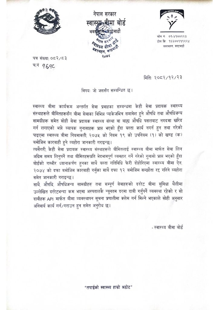 त्यस्तै, बीमा सेवा लिन आउने बिरामीलाई अग्रिम समय लिन बाध्य पार्ने तथा अन्य बिरामीको तुलनामा भेदभावपूर्ण व्यवहार गर्ने गतिविधिप्रति पनि बोर्डले गम्भीर ध्यानाकर्षण जनाएको छ। यस्ता गतिविधि नरोकिएमा स्वास्थ्य बीमा ऐन, २०७४ को दफा १२ अनुसार सम्बन्धित अस्पतालसँगको बीमा सम्झौता रद्द गरिने चेतावनी दिइएको छ।