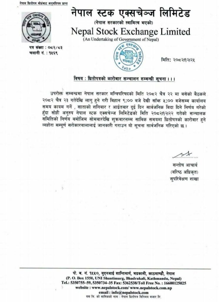 काठमाडौं– नेपाल स्टक एक्सचेञ्ज (नेप्से )ले अब सोमबारदेखि शुक्रबारसम्म सेयर कारोबार हुने जनाएको छ ।