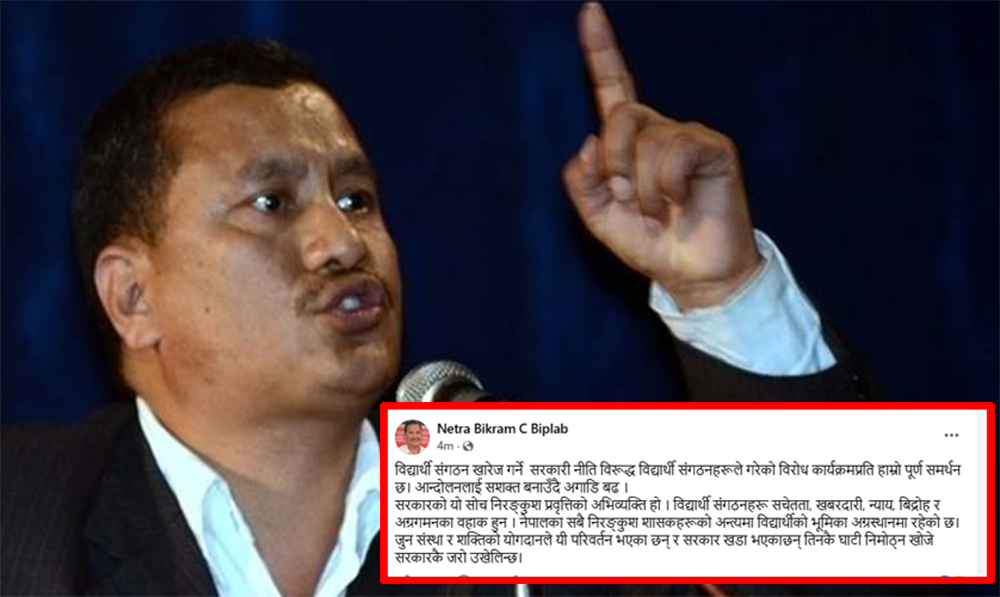 ‘सरकारको यो सोच निरङ्कुश प्रवृत्तिको अभिव्यक्ति हो । विद्यार्थी संगठनहरू सचेतता, खबरदारी, न्याय, विद्रोह र अग्रगमनका वाहक हुन्’, विप्लवले आइतबार सामाजिक सञ्जालमा लेखेका छन्, ‘नेपालका सबै निरङ्कुश शासकहरूको अन्त्यमा विद्यार्थीको भूमिका अग्रस्थानमा रहेको छ ।’