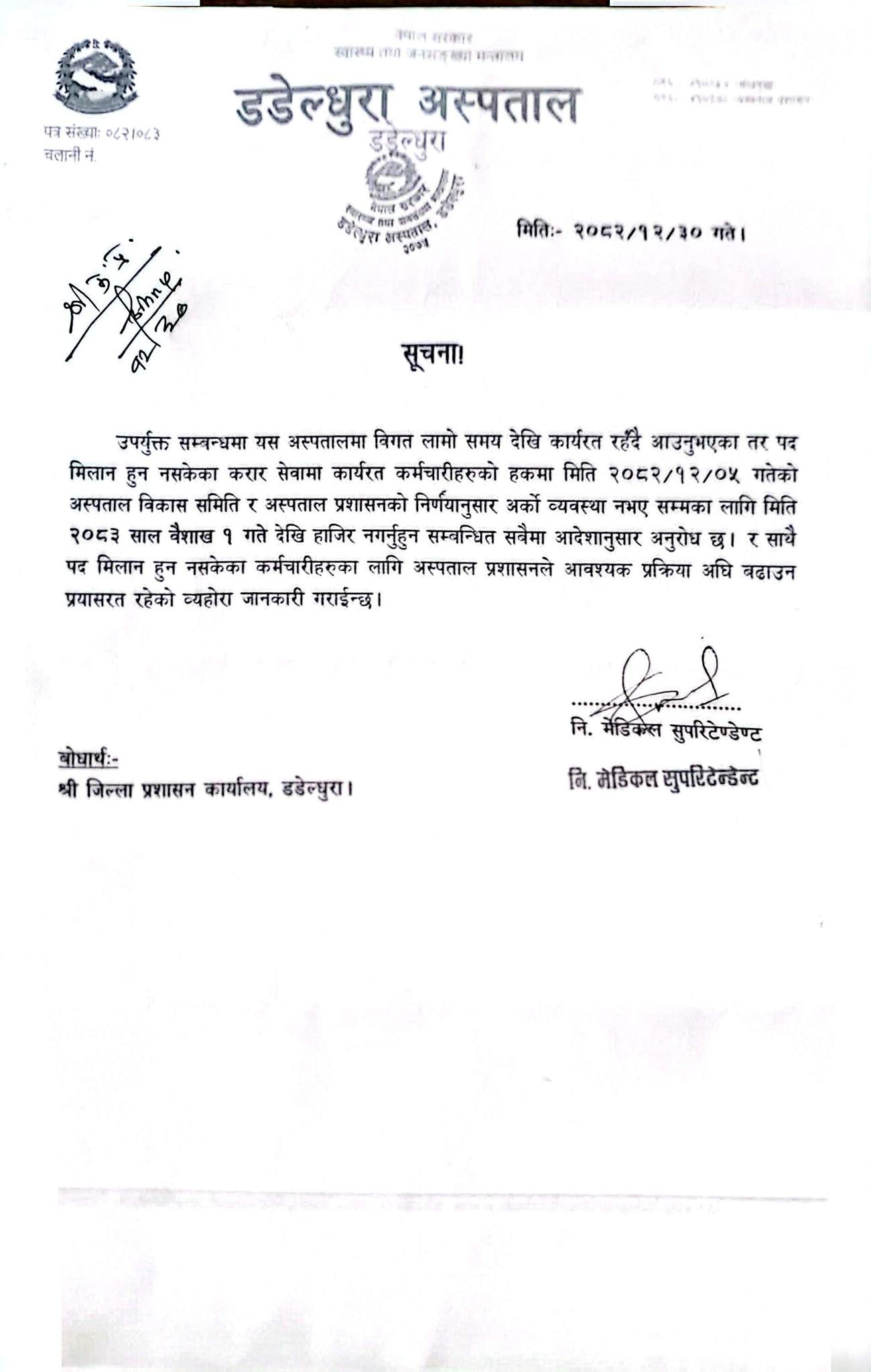 डडेल्धुरा अस्पतालले करार कर्मचारीलाई भन्यो– वैशाख १ गतेदेखि हाजिर नगर्नू
