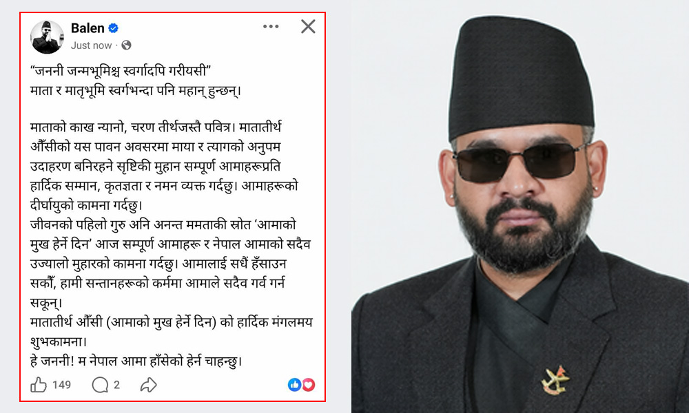 सामाजिक सञ्जालमार्फत शुभकामना दिँदै बालेन लेख्छन्, मातातीर्थ औँसी (आमाको मुख हेर्ने दिन) को हार्दिक मंगलमय शुभकामना। हे जननी! म नेपाल आमा हाँसेको हेर्न चाहन्छु।’