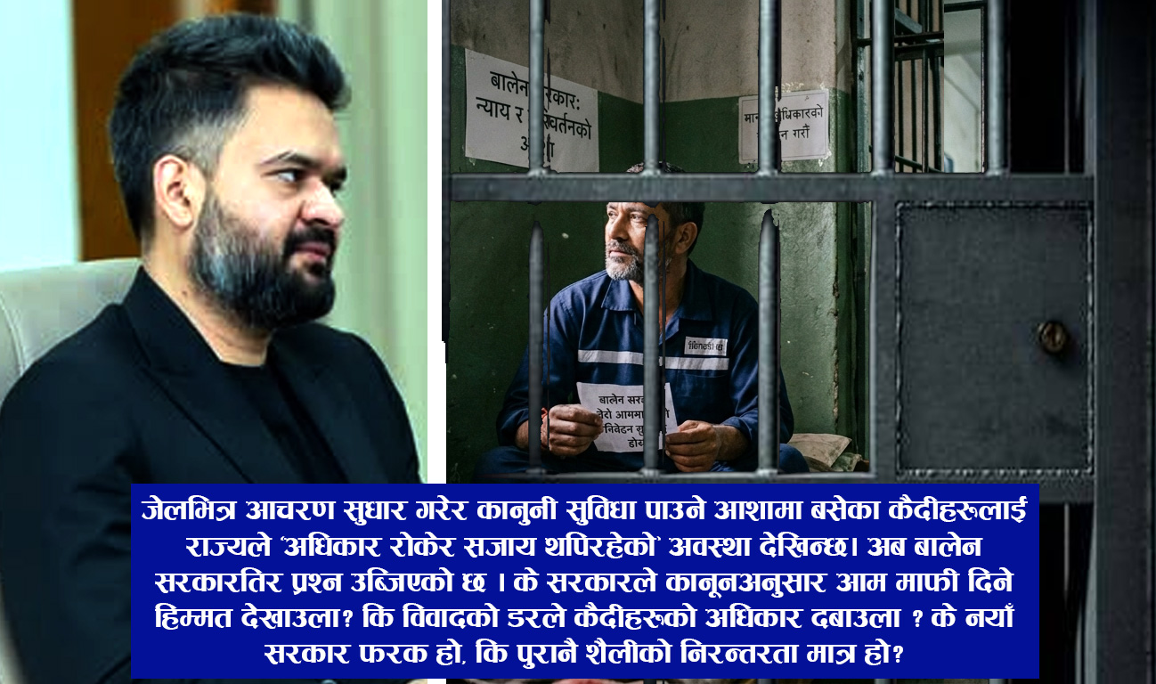 जेलभित्र आचरण सुधार गरेर कानुनी सुविधा पाउने आशामा बसेका कैदीहरूलाई राज्यले “अधिकार रोकेर सजाय थपिरहेको” अवस्था देखिन्छ। अब बालेन सरकारतिर प्रश्न उब्ज़िएको छ । के सरकारले कानूनअनुसार आम माफी दिने हिम्मत देखाउला? कि विवादको डरले कैदीहरूको अधिकार दबाउला ? के नयाँ सरकार फरक हो, कि पुरानै शैलीको निरन्तरता मात्र हो?