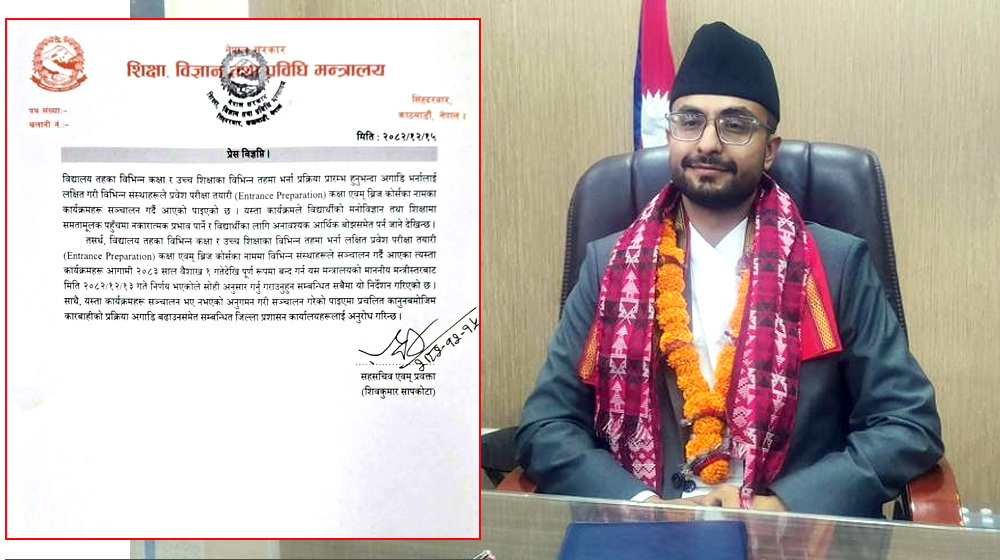 काठमाडौं – शिक्षा विज्ञान तथा प्रविधि मन्त्रालयले इन्ट्रान्स तयारी कक्षा र ब्रिज कोर्सहरू बन्द गर्न निर्देशन दिएको छ । — विस्तृतमा