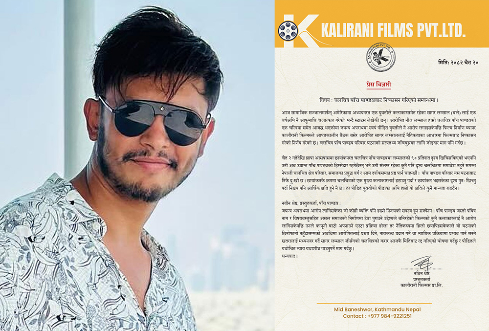 काठमाडौं – अमेरिकामा अध्ययनरत एक युवतीले सामाजिक सञ्जालमार्फत कलाकार सागर लम्साल ‘बले’ माथि बलात्कारको आरोप लगाएपछि उनलाई चलचित्र ‘पाँच — विस्तृतमा