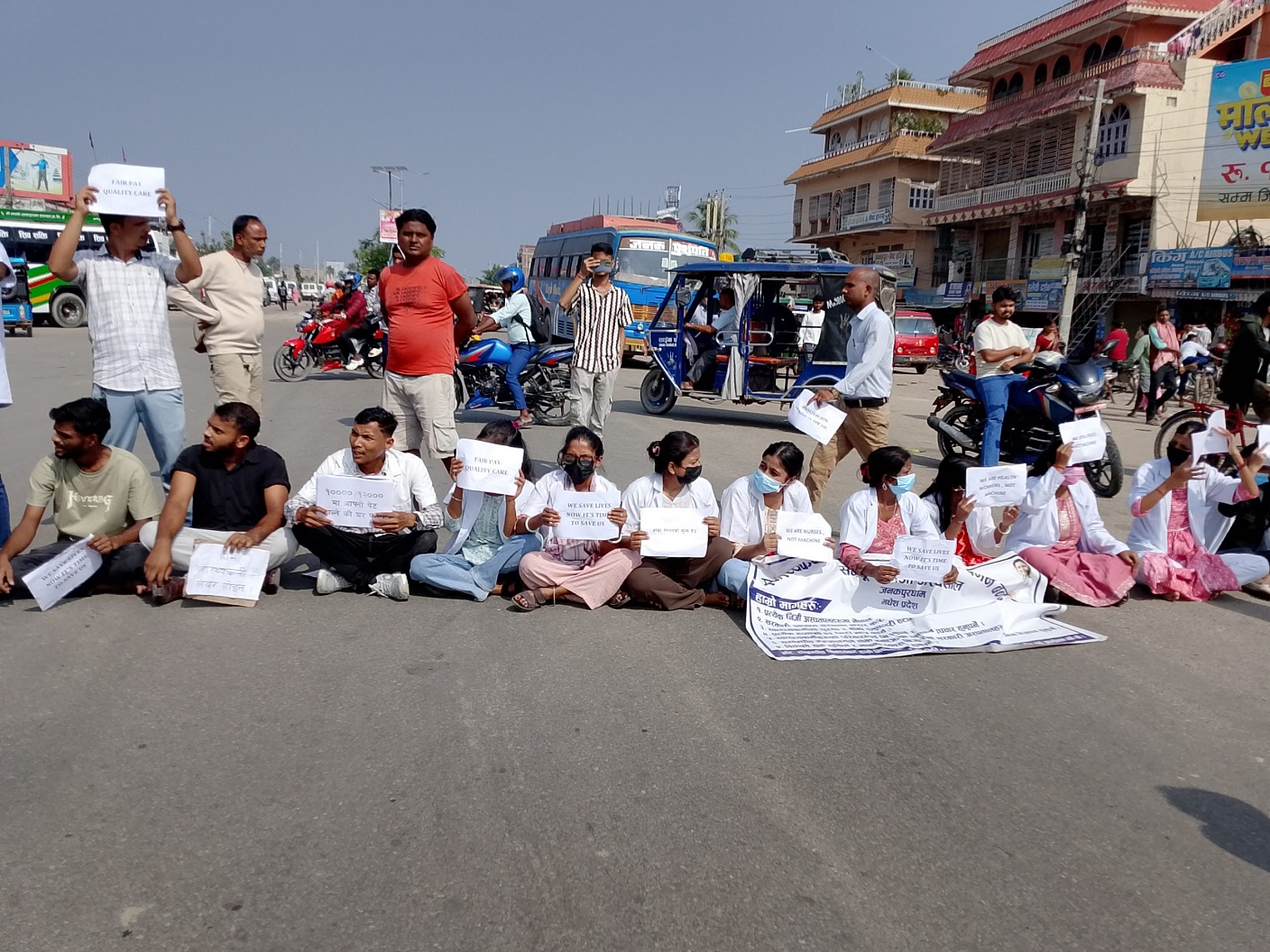 जनकपुरधाम–ढल्केवर सडक खण्डमा निजी अस्पतालका स्वास्थ्यकर्मीहरूले प्रदर्शन गर्दै सडक अवरुद्ध गरेका छन्। बुधबार रामानन्द चोकस्थित ‘सिक्स–लेन’ सडकमा स्वास्थ्यकर्मीहरूले सडकमा — विस्तृतमा